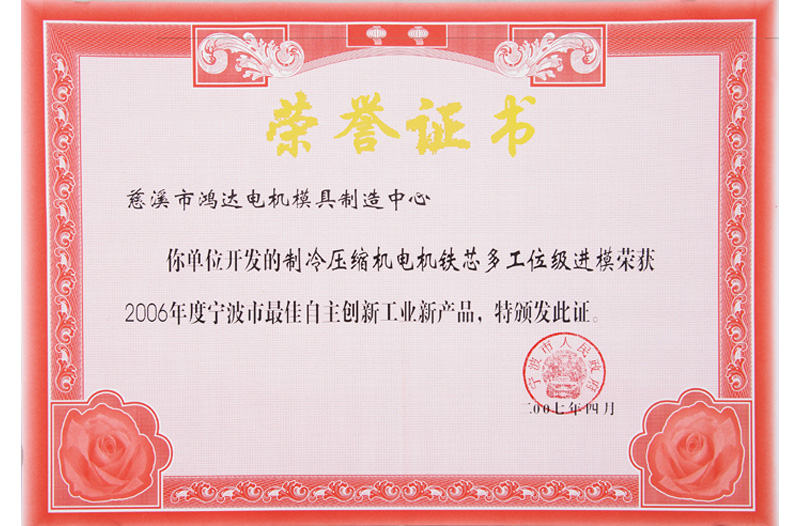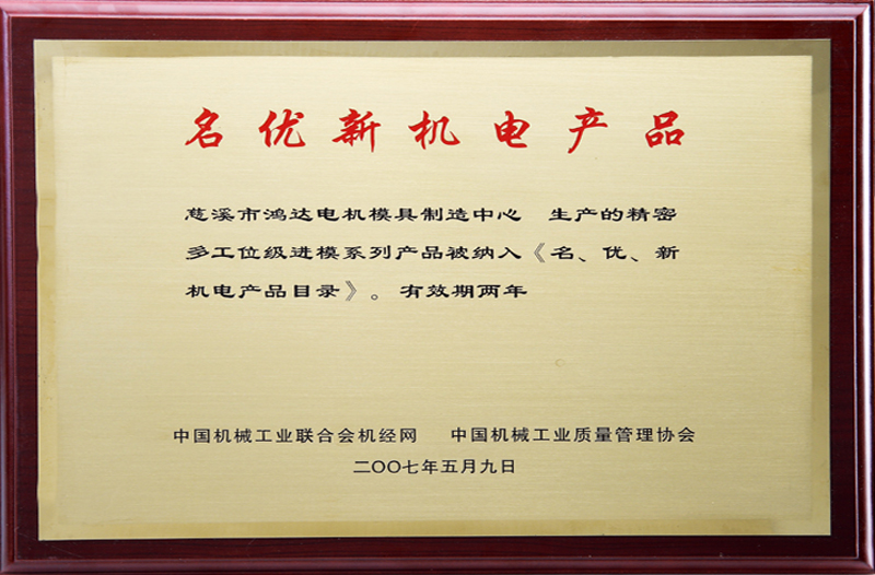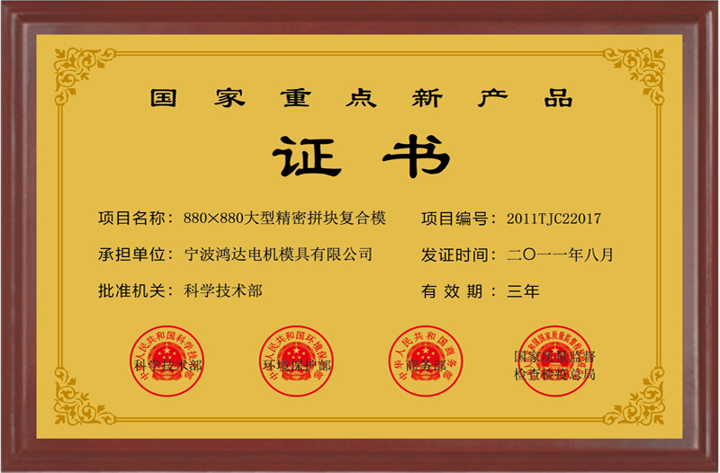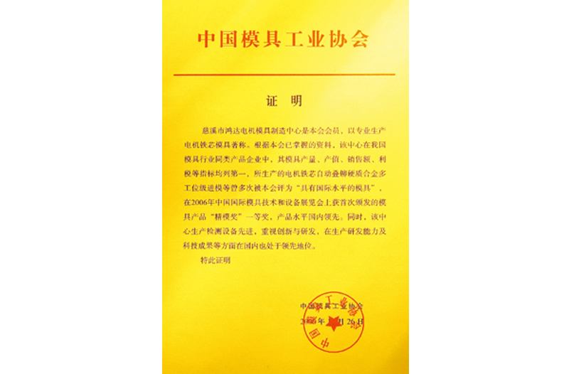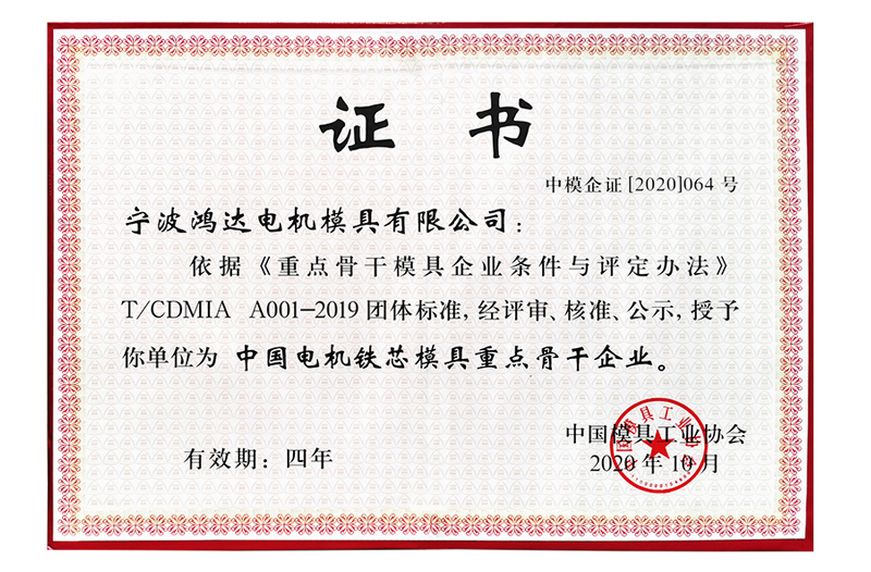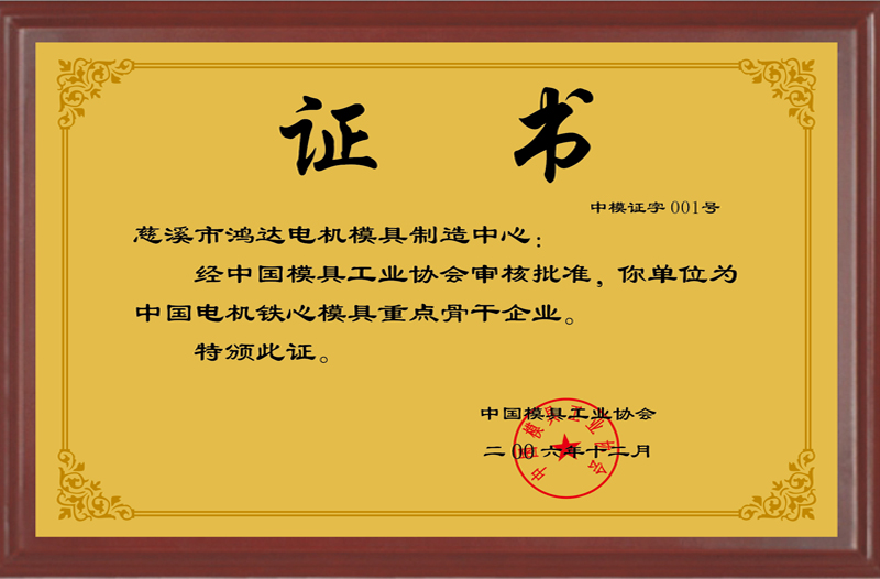 我们以国际先进的管理模式和规范来要求自己,先后通过了ISO9001: 2015质量体系认证、ISO14001: 2015环境管理体系、ISO45001职业健康安全管理体系认证及IATF16949质量管理体系认证,公司还获得了中国电机铁芯模具重点骨干企业证书、中国重点骨干模具企业(电机铁芯模具)、国家重点新产品证书、中国机械工业质量诚信企业证书等,同时我司还是“国家高新技术企业”和“慈溪市制造业(模具)创新中心”。